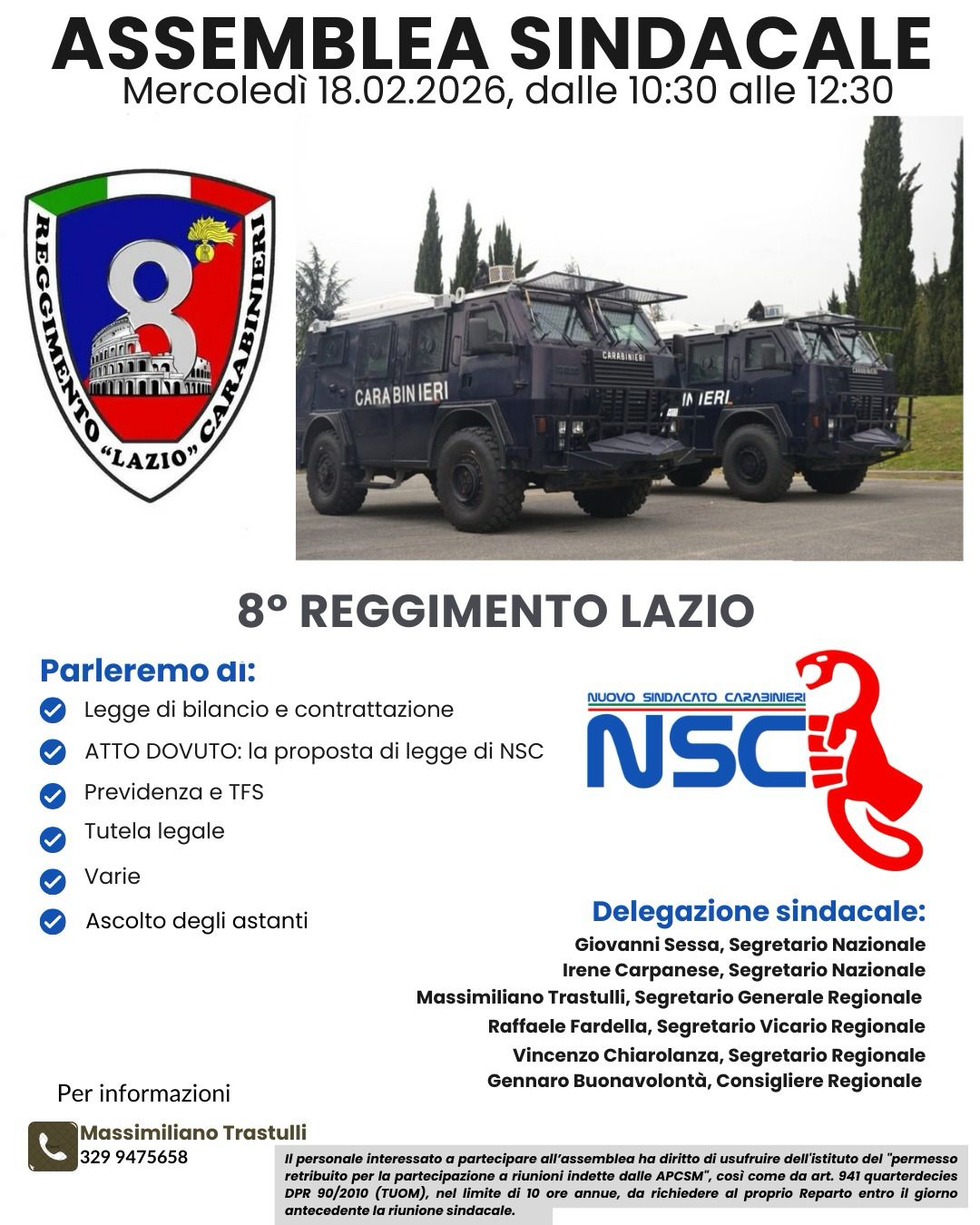 Il giorno 18 febbraio 2026 la Segreteria Regionale Lazio sarà presente presso l’8° Reggimento Carabinieri Lazio per un’assemblea sindacale.