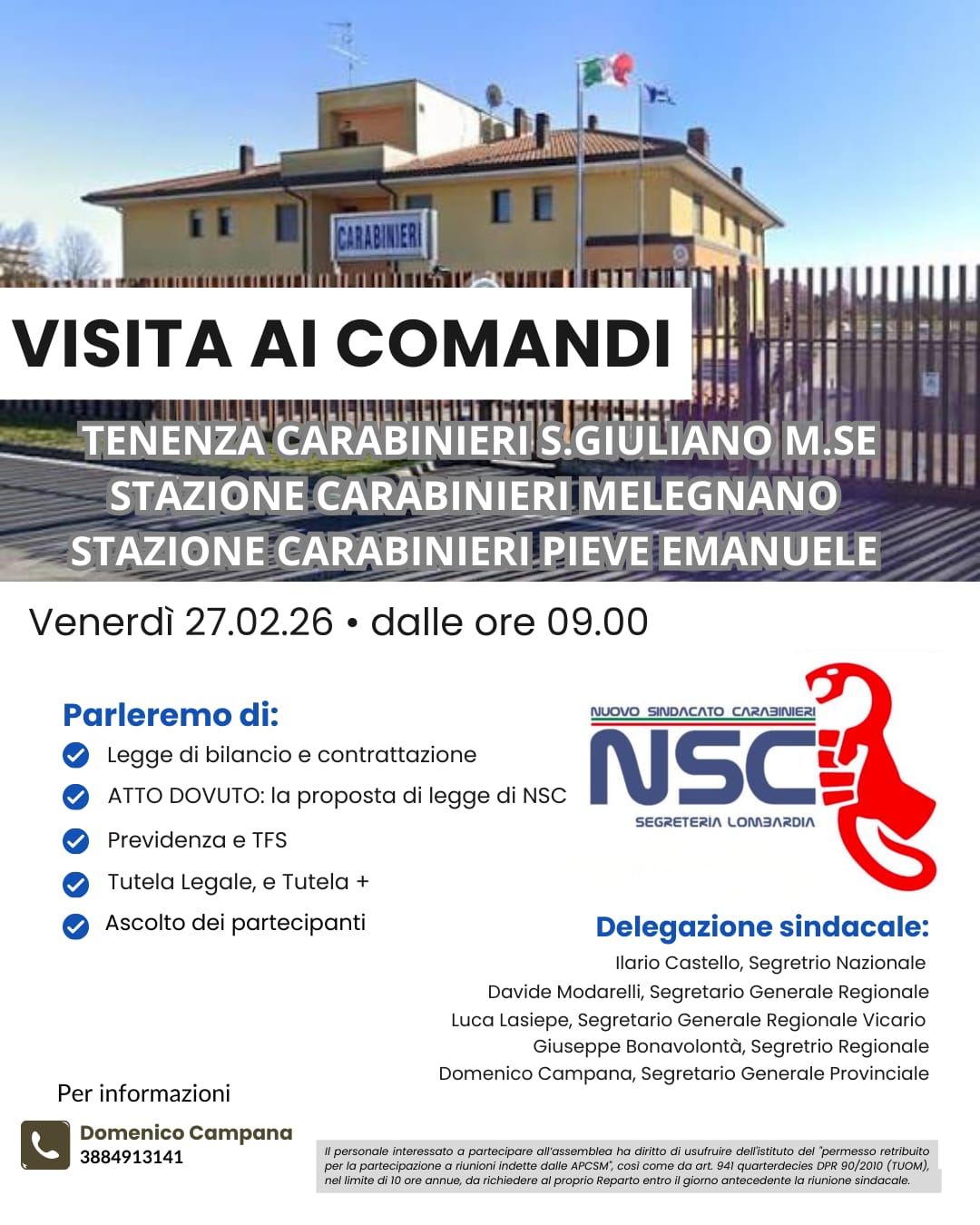 Il giorno 27 febbraio 2026 la Segreteria Regionale Lombardia sarà presente presso i seguenti reparti per una serie di visite sindacali: