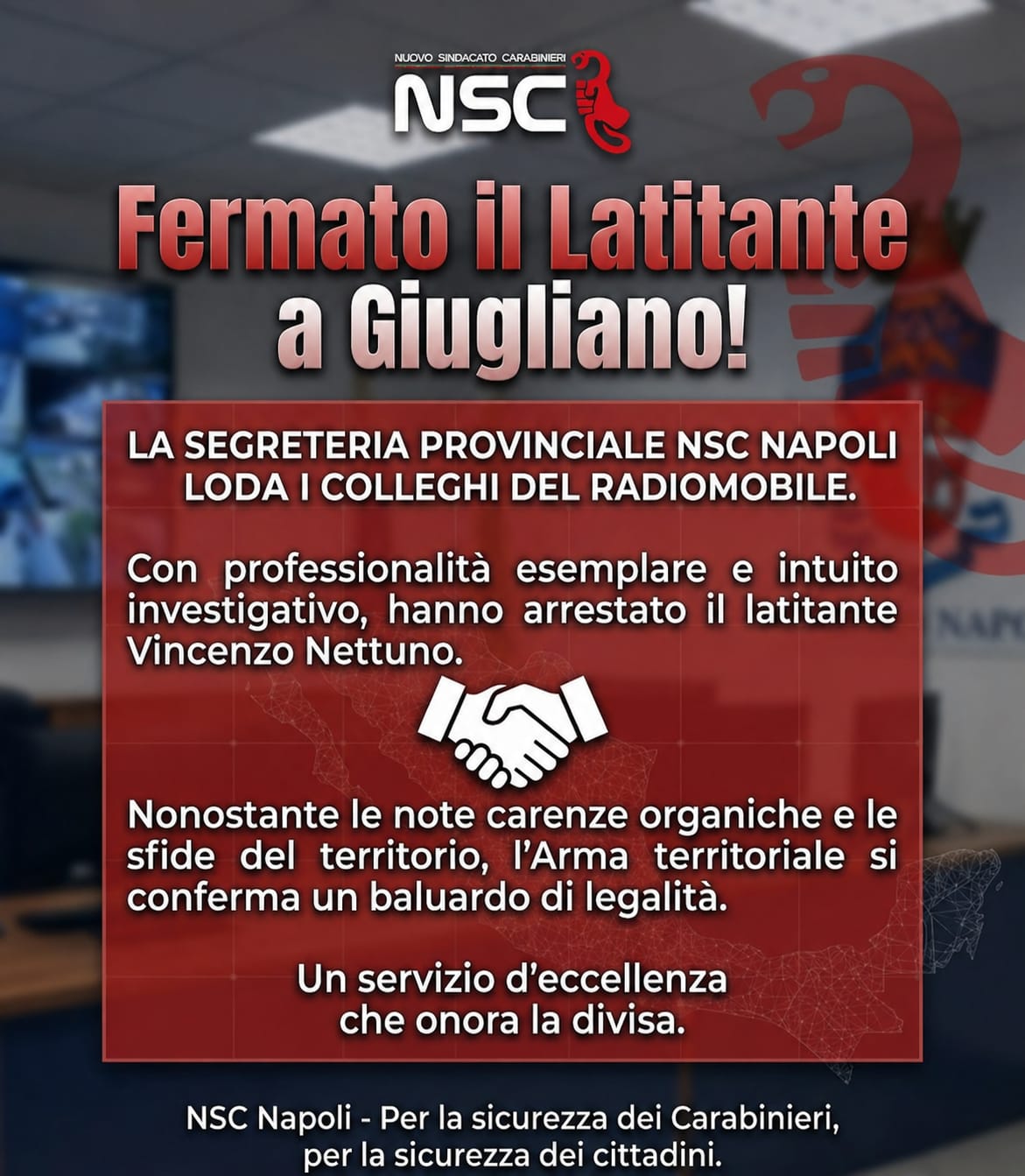 NAPOLI – La Segreteria Provinciale di Napoli del Nuovo Sindacato Carabinieri (NSC) esprime il proprio vivo compiacimento e il più sentito plauso ai colleghi della Sezione Radiomobile di Giugliano in Campania per la brillante operazione che ha portato, nella giornata del 25 aprile, all’arresto del latitante maranese Vincenzo Nettuno.
