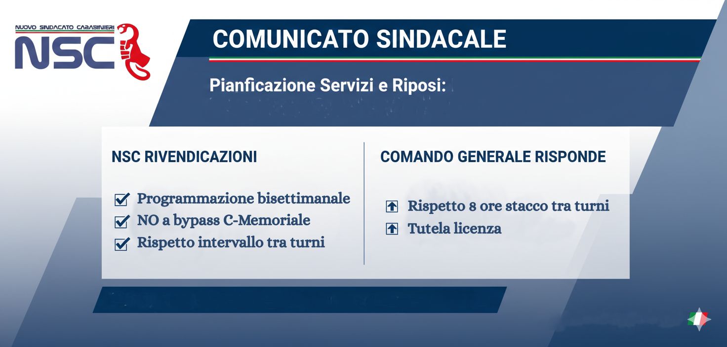 Il Nuovo Sindacato Carabinieri esprime profonda soddisfazione nel veder concretizzate le proprie istanze relative alla corretta gestione dei turni di servizio e dei riposi settimanali. La recente nota emanata dal Comando Generale dell’Arma, rivolta alle APCSM, rappresenta un sigillo di garanzia per i diritti del personale e conferma l’efficacia dell’azione sindacale portata avanti con costanza da questa sigla.