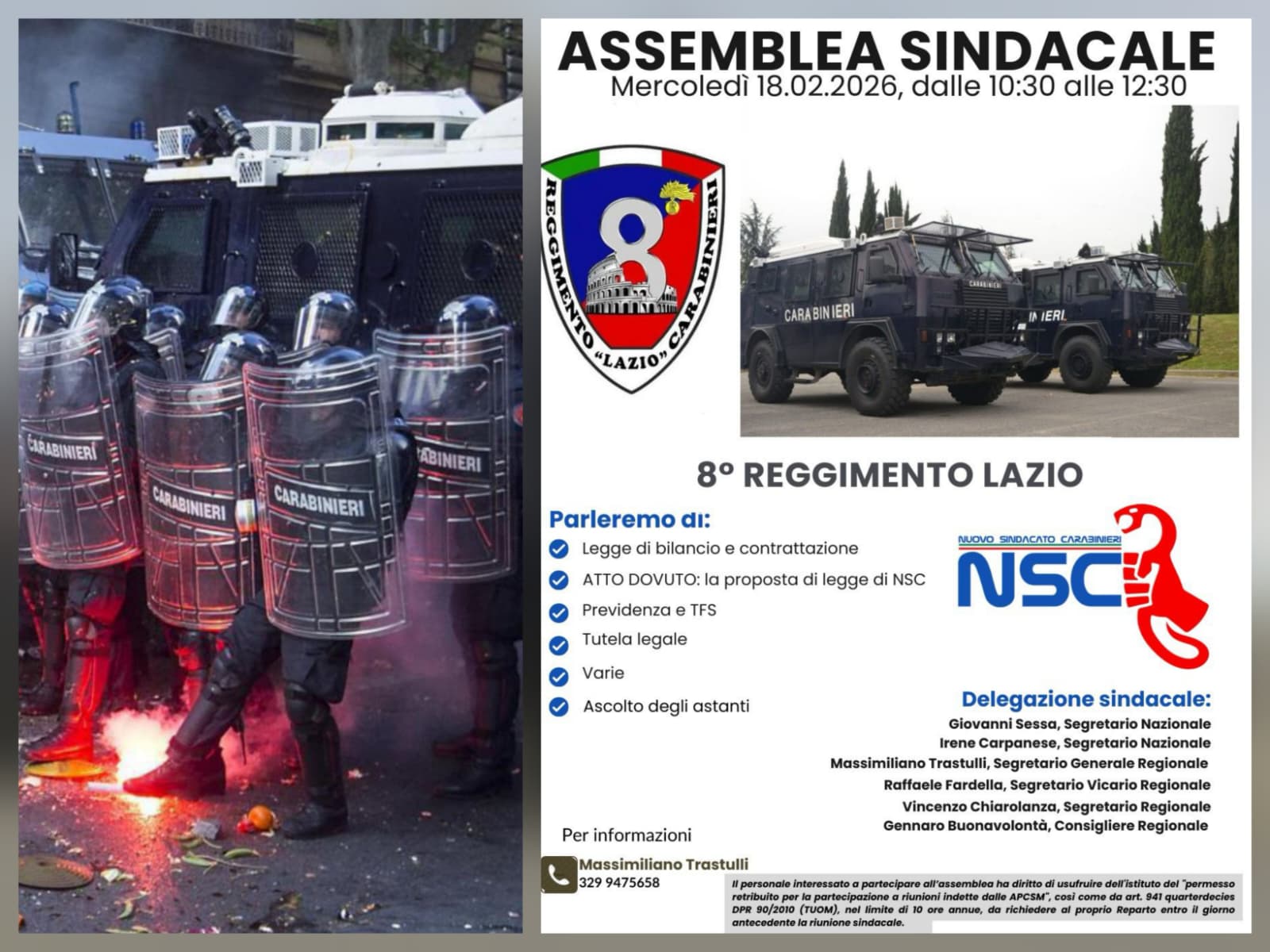 Il Nuovo Sindacato Carabinieri (NSC) comunica a tutto il personale che mercoledì 18 febbraio 2026, dalle ore 10:30 alle ore 12:30, si terrà un’importante Assemblea Sindacale presso i locali dell’8° Reggimento Carabinieri “Lazio” in Roma.