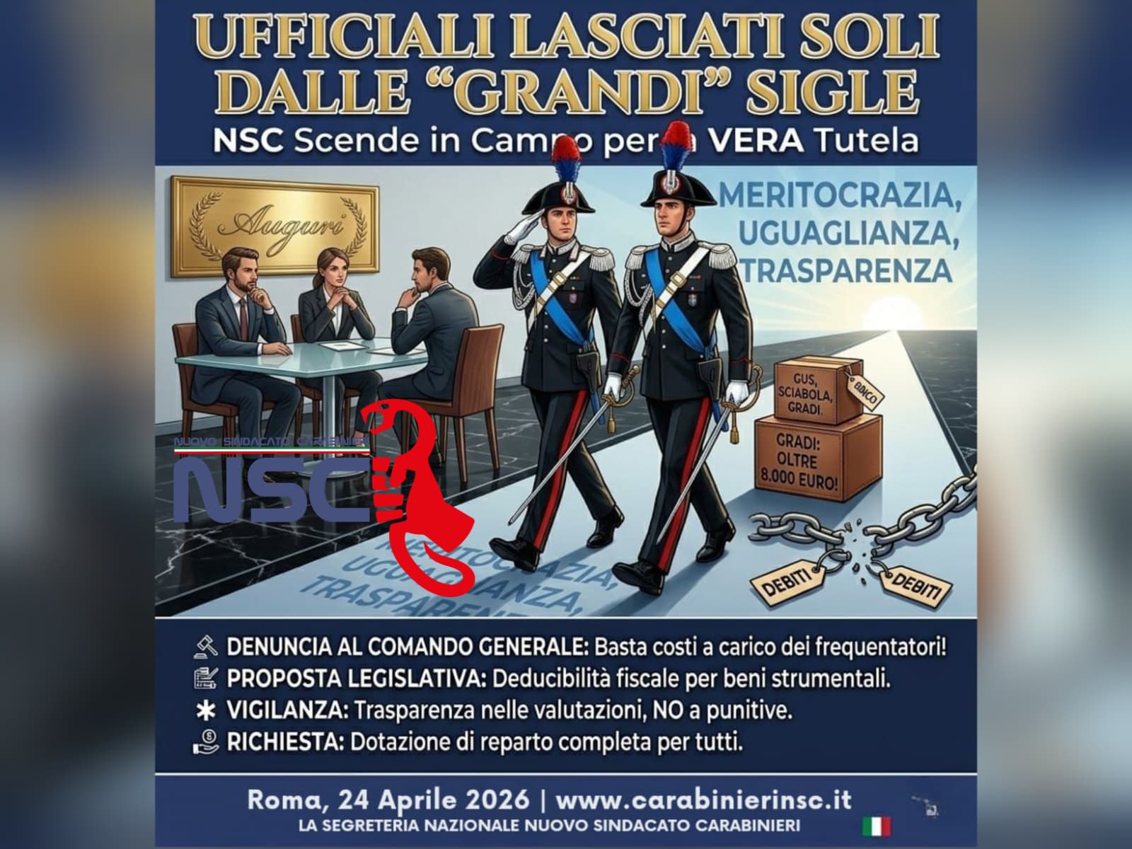 Vi auguriamo di avere il coraggio di scegliere la strada delle vere tutele. NSC continuerà a battersi per un’Arma dove regnino meritocrazia, uguaglianza e trasparenza, affinché nessun percorso di carriera debba iniziare sotto il peso di debiti ingiusti.