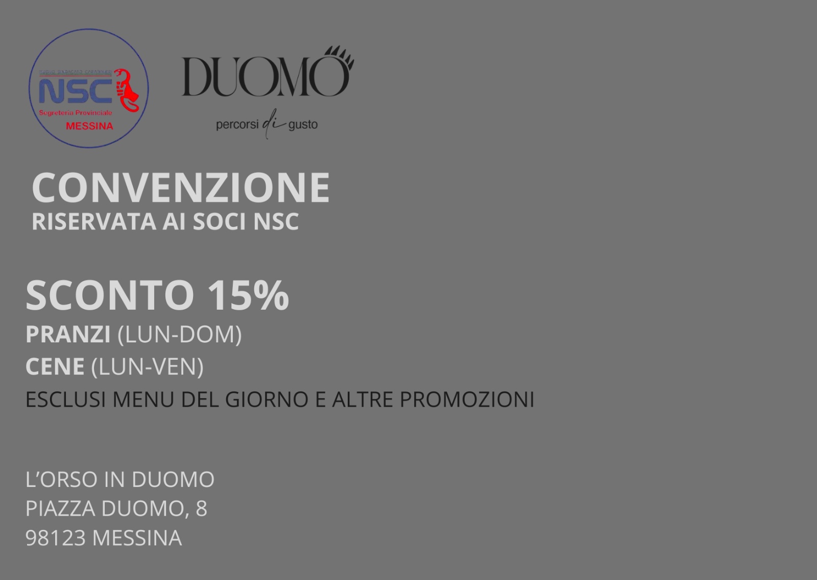 La Segreteria Provinciale di Messina ha stipulato una convenzione con la 3G s.r.l. di seguito denominata Orso in Duomo operante nel settore della ristorazione, che ha riservato agli iscritti del Nuovo Sindacato Carabinieri condizioni agevolate.