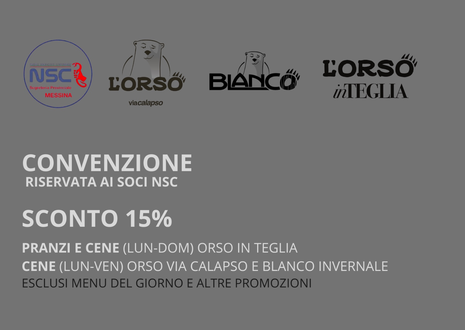 La Segreteria Provinciale di Messina ha stipulato una convenzione con ” Antema s.r.l. di seguito denominata Orso Group” operante nel settore della ristorazione, che ha riservato agli iscritti del Nuovo Sindacato Carabinieri condizioni agevolate presso i locali del gruppo.