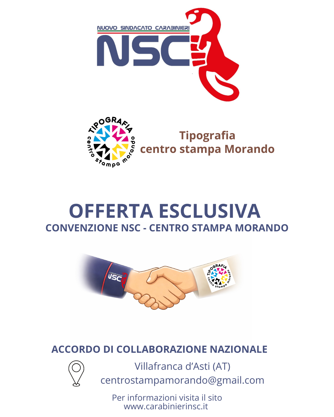 La segreteria Regionale Piemonte ha stipulato una convenzione con “centro stampa Morando” di Villafranca d’Asti, che ha riservati agli iscritti del Nuovo Sindacato Carabinieri condizioni agevolate.