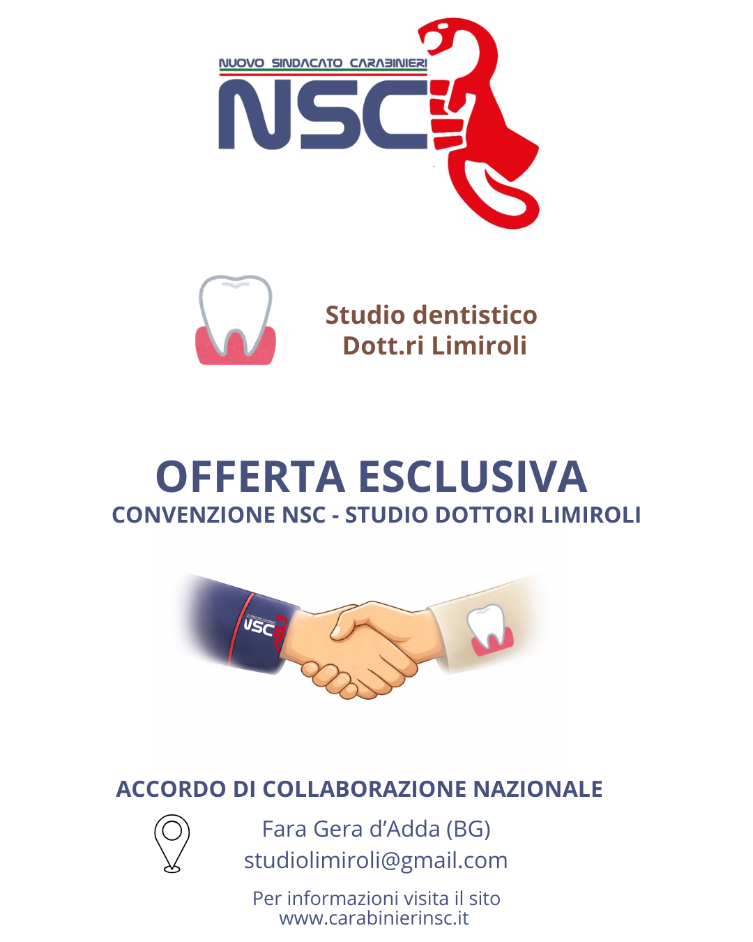 La segreteria Regionale Lombardia ha stipulato una convenzione con “studio dottori Limiroli” di Fara Gera D’Adda, che ha riservati agli iscritti del Nuovo Sindacato Carabinieri condizioni agevolate.