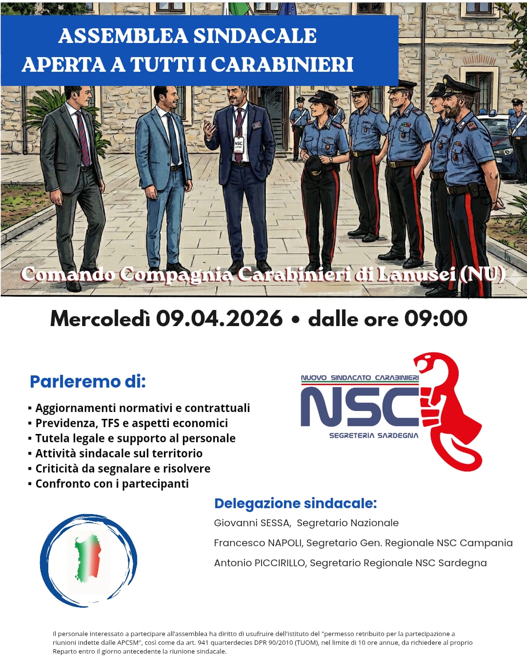 Mercoledì 09.04.2026 venite a conoscere il Nuovo Sindacato Carabinieri, Segreteria Regionale Sardegna. Una delegazione di dirigenti sarà in visita presso la Compagnia Carabinieri di Lanusei (NU) a partire dalle ore 09:00.