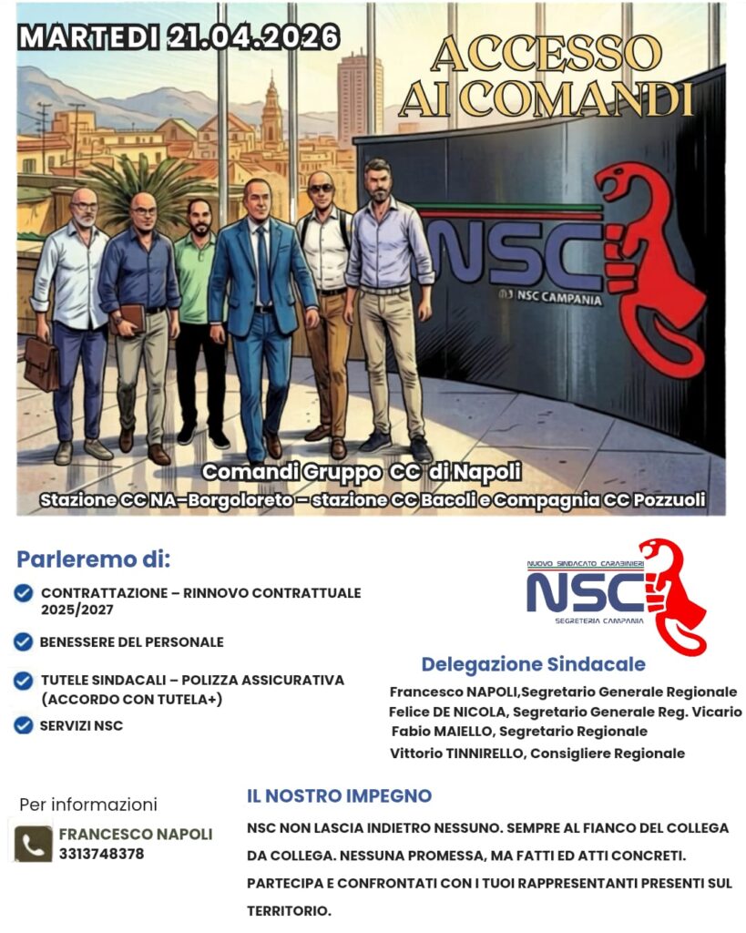 Nella mattinata del 21 aprile 2026 una delegazione della Segreteria Regionale Campania del Nuovo Sindacato Carabinieri sarà in visita presso alcuni reparti della Provincia di Napoli, per incontrare i colleghi, recepire proposte e criticità e rappresentare le attività di NSC e i servizi che offriamo agli iscritti.