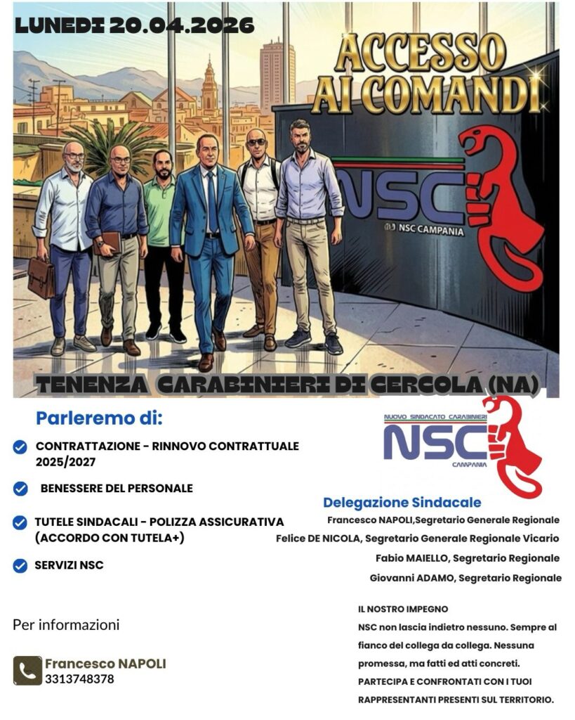 Nella mattinata del 20 aprile 2026 una delegazione della Segreteria Regionale Campania del Nuovo Sindacato Carabinieri sarà in visita presso la Tenenza di Cercola (NA), per incontrare i colleghi, recepire proposte e criticità e rappresentare le attività di NSC e i servizi che offriamo agli iscritti.