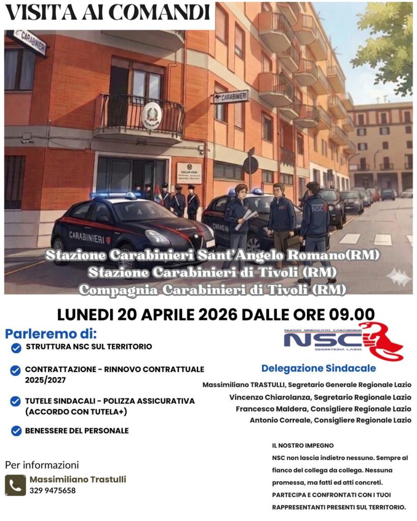 Il giorno 20 aprile 2026 la Segreteria Regionale Lazio, a partire dalle ore 09:00, sarà in visita sindacale presso alcuni reparti di Roma per incontrare i colleghi, rappresentare le attività e le idee di NSC e recepire proposte o esigenze da parte dei colleghi.