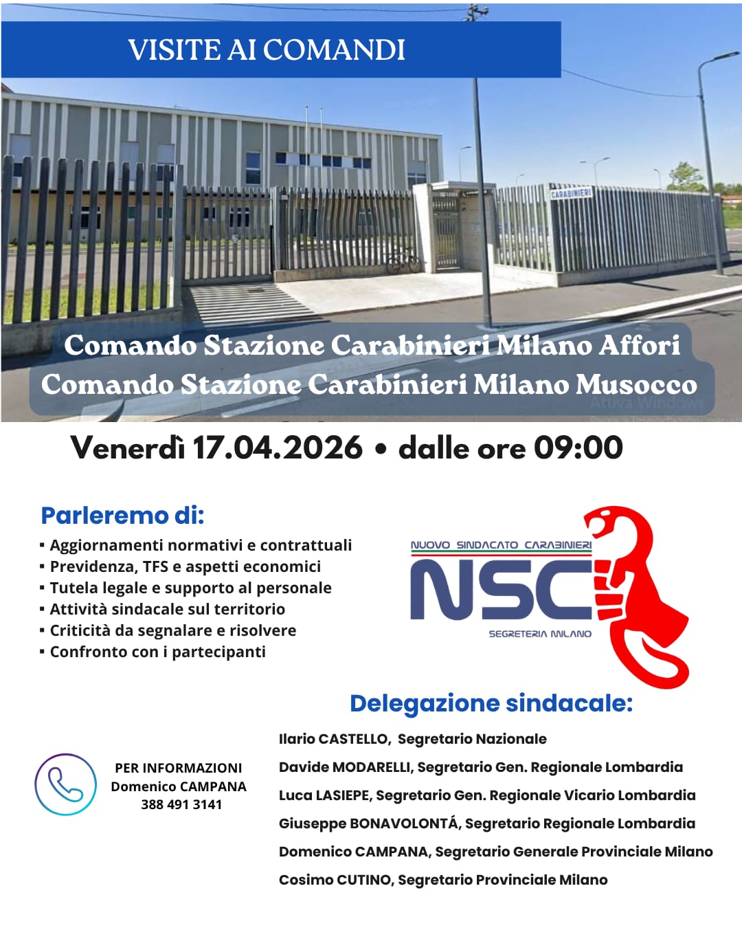 La Segreteria Regionale Lombardia del Nuovo Sindacato Carabinieri, accompagnata dal Segretario Nazionale Ilario Castello, visiterà i comandi Stazione di Milano Affori e Milano Musocco, nella mattinata di venerdì 17.04.2026 a partire dalle ore 09:00.