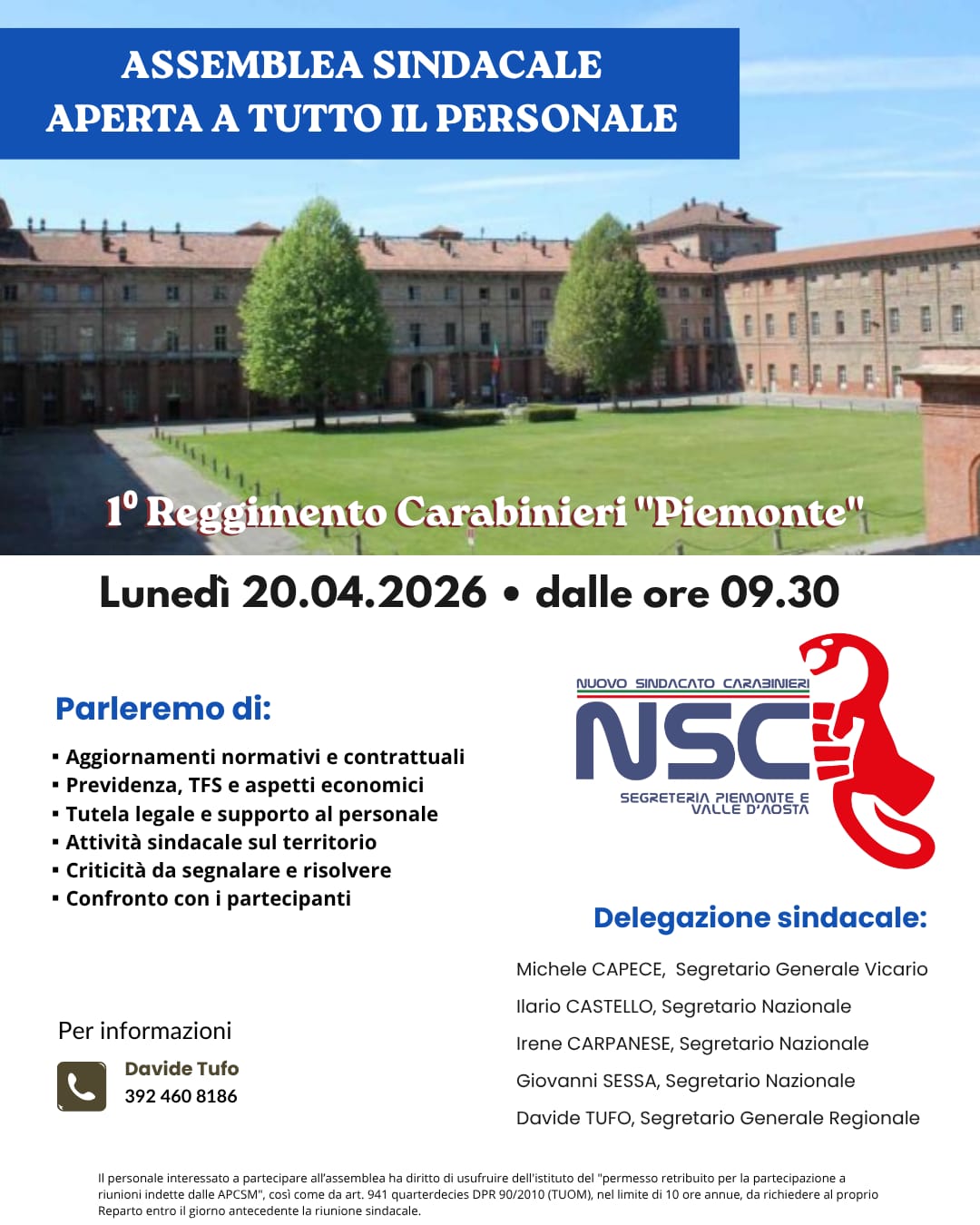 Il giorno 20 aprile 2026 la Segreteria Regionale Piemonte e Valle d’Aosta con una delegazione della Segreteria Nazionale ha indetto un’assemblea sindacale presso il 1° Reggimento Carabinieri Piemonte.