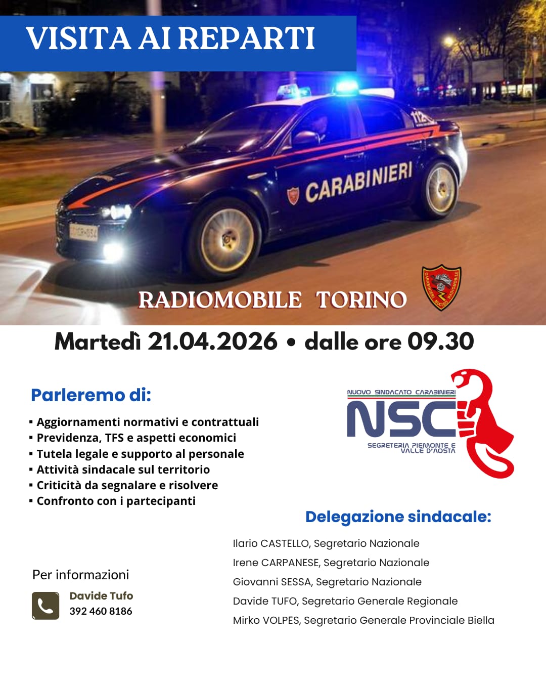 Il giorno 21 aprile 2026 la Segreteria Regionale Piemonte e Valle d’Aosta, insieme a una delegazione della Segreteria Nazionale sarà presente presso il Nucleo Radiomobile di Torino per una visita sindacale.